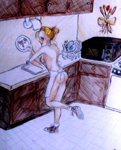 Picture of nude woman doing the dishes