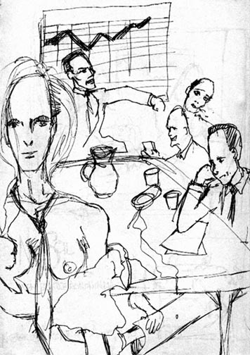 This is the concept drawing for office fight 1. As you may see, I was very faithful to the initial idea. This would be the foundation for Twitch's never released "Medicine Ball" RCA release cover. 1994
