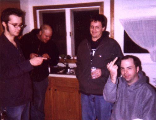 A quick snap on Bank's Polaroid of Thought Industry's Jeff Borkowski, Mark Baldwin, Cam Taylor, and Mike Roche (in obligitory punk mode) at the Till kitchen, having some pops, at about 5 AM after the November 21, 2001 Portland ME show.