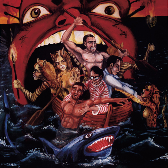 This is the front cover of the CD (thanks, buddy). The original is 5 foot square, done in oils, and now hangs in Xavi's living room. Its of the heros rescuing naked cat women from a shark and large, devilish demon. The 'heros' were painted by Jeff from memory, and some people have accused Jeff of making them less fat and ugly than they actually are in life. The original has pentagrams on the face of the devil, which were photoshoped out for the cover at the Professor's request.