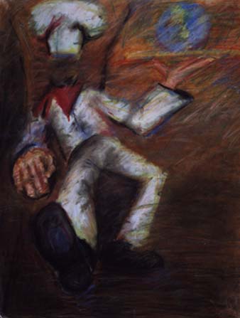 Many of my art teachers in Kalamazoo were merely old mothers who managed to get an art degree from Western (much like myself). As it goes, they were never particularlly good, plus they were sensitive to non-"g" rated material. Although this rendering is tame compared to many of my other pieces, I was told that this was inappropriate for school as well. The painting was supposed to be of God portrayed as a baker. The offensive part, I was told, was how casually his foot was laid forward. Go figure. Its in pastels and probably finished in 1991.