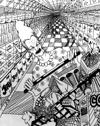 This magic marker drawing was done for a forced-perspective exercise. I know it was done in 1989 or 90 because of the references to friends at the time in the products on the shelf. None of these friendships were necessarily sustainable, as I have no idea where they are now.