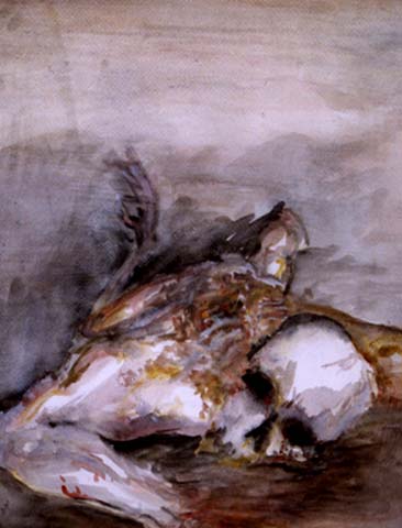 Part of a seven painting series about Jesus. My teacher had pushed me out of a window to enter a courtyard where a mutilated dead bird was. I painted it and this came out. (1989)
