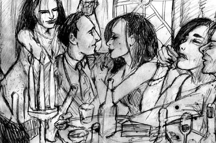 Sketch of party of drinkers, drinkers at a party