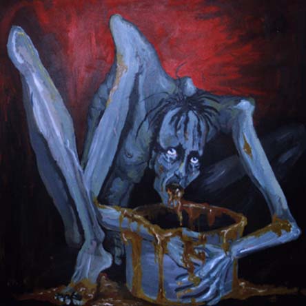 This acrylic on canvas was completed at the same time as Loopus Doofus. The assignment was to draw a picture of some folded paper, and, hating my teacher, I painted a picture of a monster puking in a bucket. This hangs up in my closet/studio, and my wife likes to shake her head at it. My mom would never hang this up.
