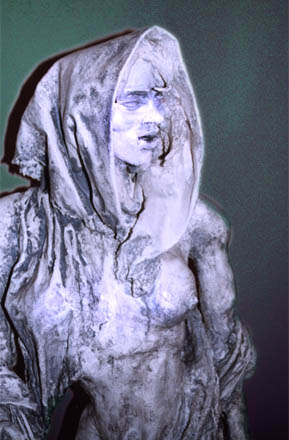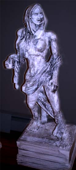 My first sculpture (save a small, working fountain, which has now been trashed) is called "The Surprised Slave". I finished it in the summer of 1999 and it is made of wood, plastic, water putty, self-hardening clay, paint and electrical tape. It stands about 5 feet tall and I'm very enamoured with it. People who see it say it's impressive for a first effort, but it looks like a dude with tits. At any rate, I'm going to further explore sculpture when the wheather is nice enough to work outside.
