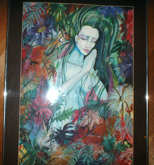 This painting of a wood faerie peacefully praying in the flowers. This unusually tame picture (where's the humor?) might appeal to the LOTR's set (which I guess is me, which maybe that was the joke). I gifted this painting to Craig Verity probably in 1992 or 1993, who still has it, and in fact, snapped this picture of it hanging in is San Diego Apartment.