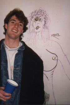 Dave Nash at a Four Piece party (probably the Overwoman show, as there was a camera available) standing next to a KINZ original (Kinzy, I beleive, was a school chum of Jared's, and did the design of the TABLE: BLANK CD cover). This is just a coincidence. Note: D. Austin comes close to supporting a mullet here.