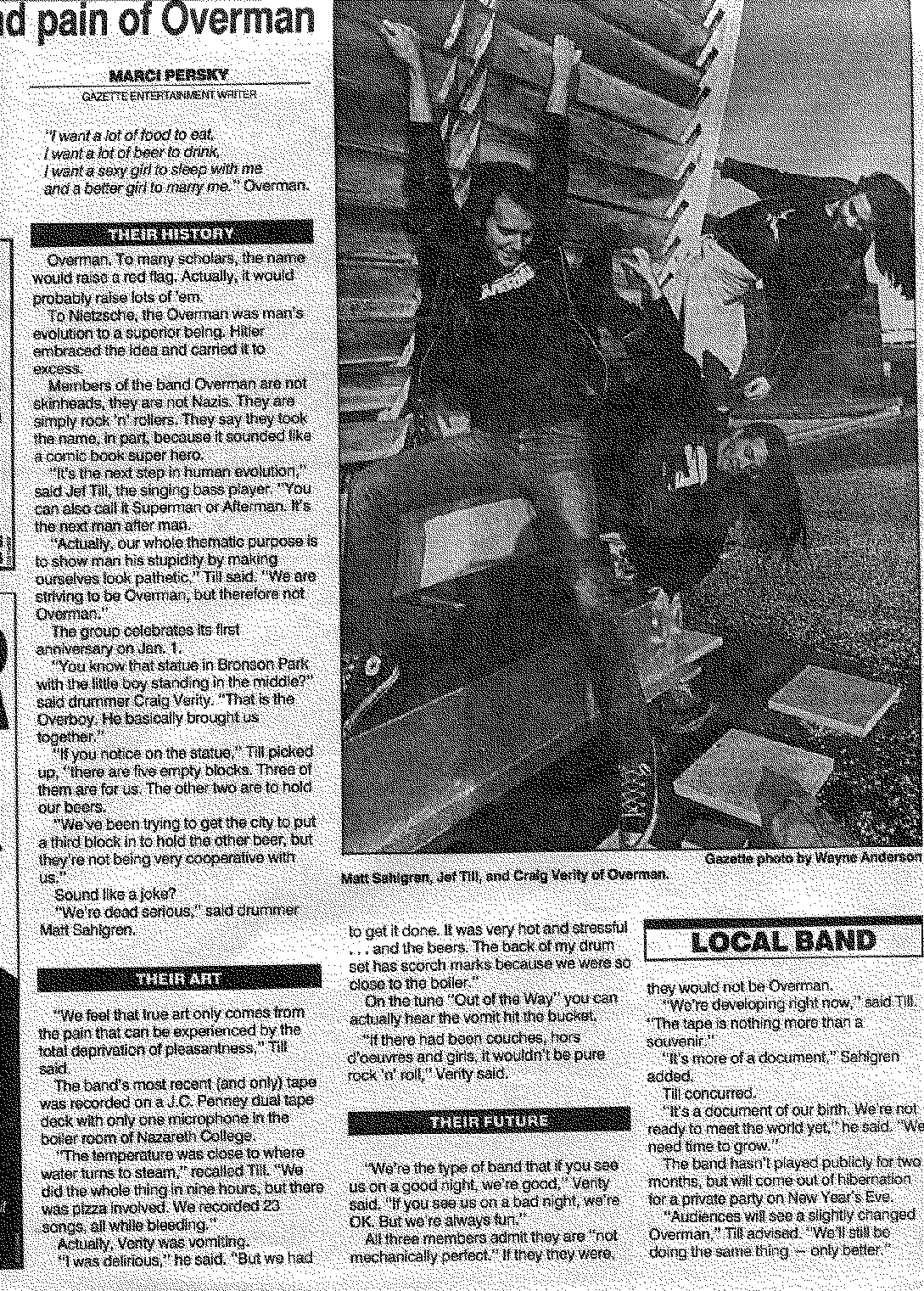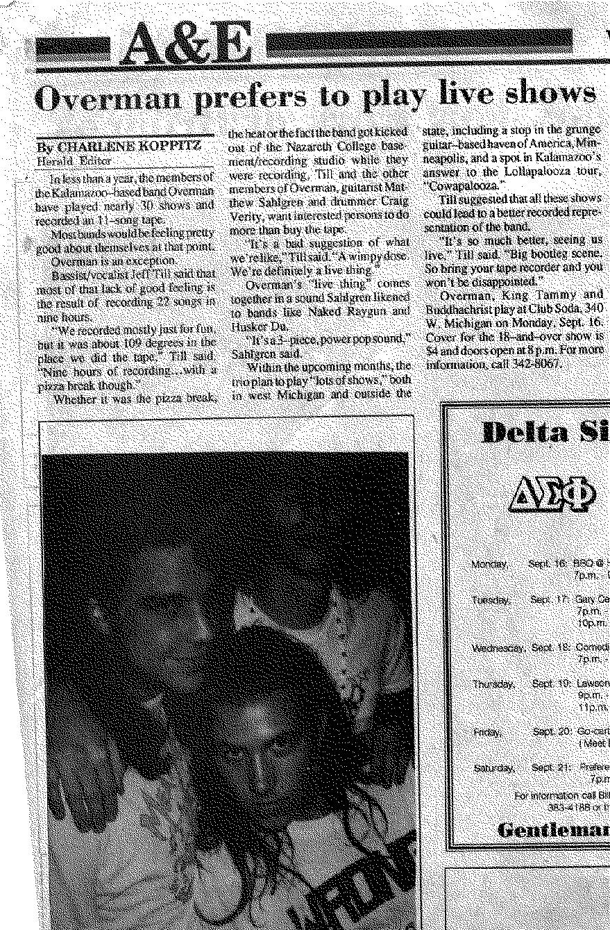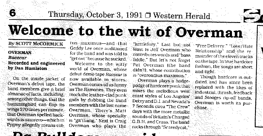 Overman, with its fleeting, dull year-long spark didn't grab mass media attention. We did get a smidgeon here and there from some of Kalamazoo's finest publications. Craig gave all of these to a year ago and I was very happy that he kept them. To capture that "newsy" effect, I've scanned them as giant, ugly bit-maps (plus there was no way I was going to re-key them).